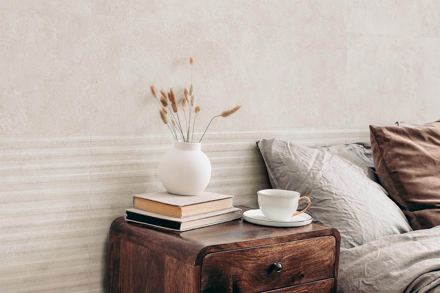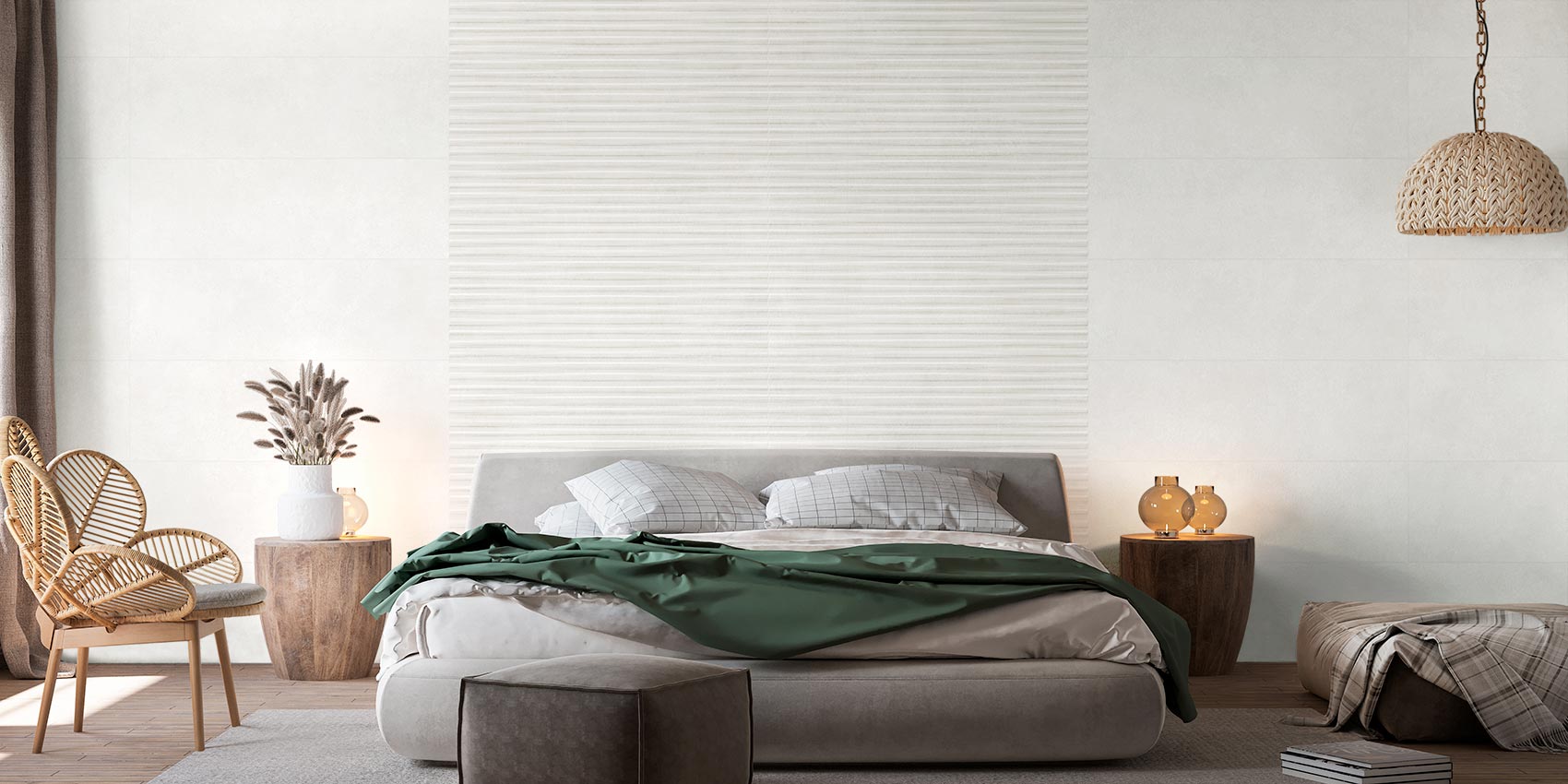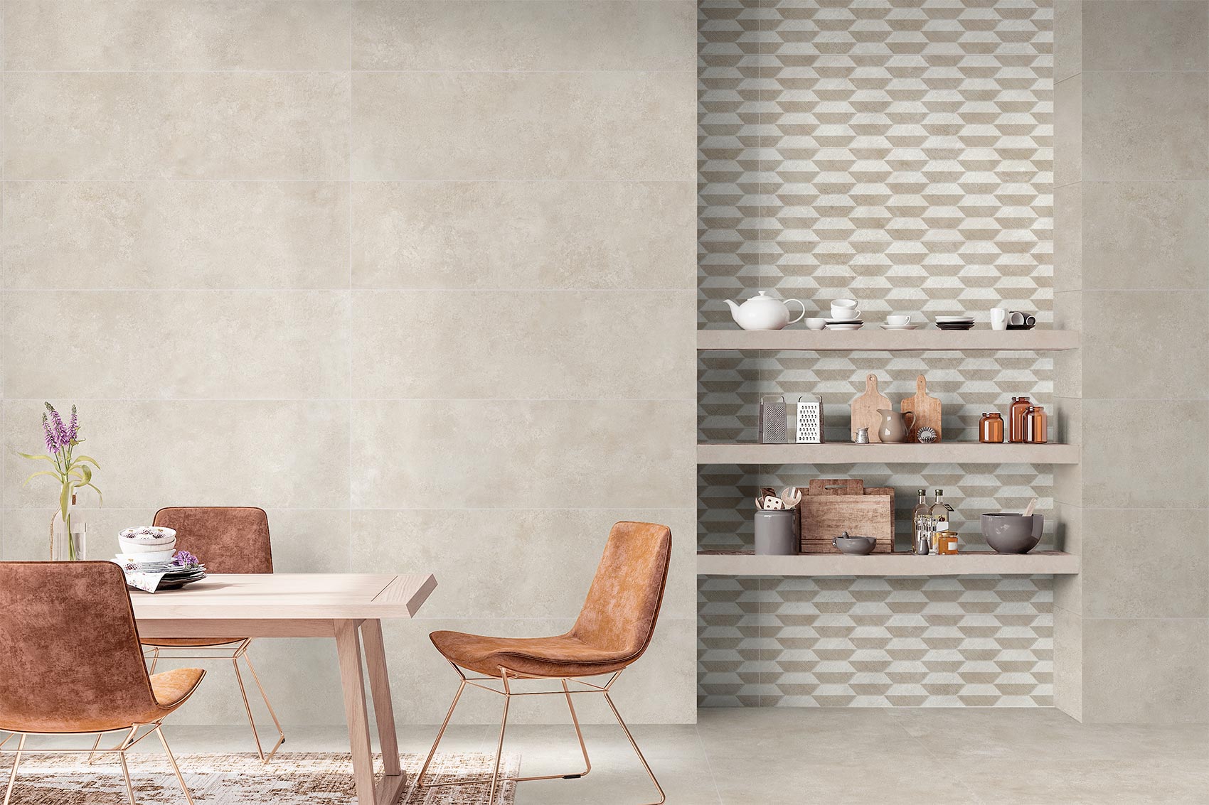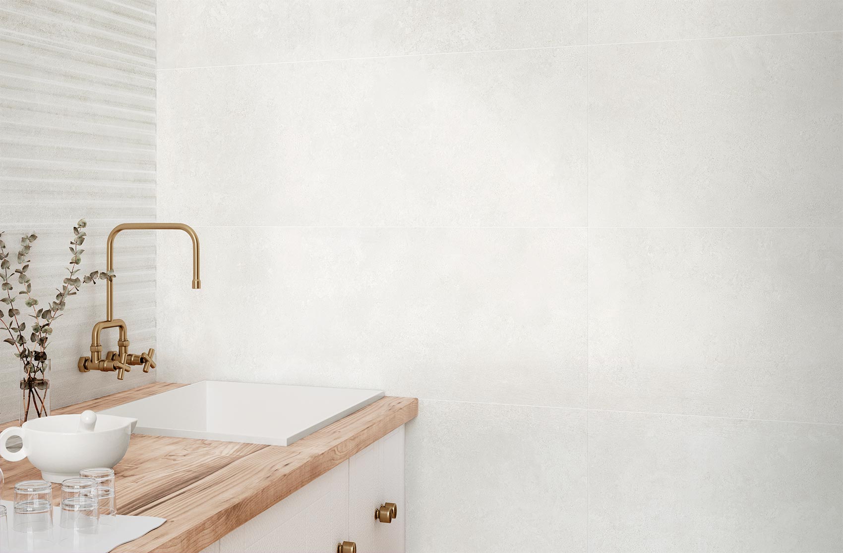 Revestimientos de pasta blanca en 31,6x100 y pavimento porcelánico coordinado en 59,5x59,5. A las dos bases: White y Beige, en colores claros y muy cálidos, se le añade un relieve y un decorado. Mientras que el relieve aporta calma y tranquilidad gracias a sus líneas horizontales en relieve y bajo relieve, el decorado combina formas poligonales en las dos tonalidades de la serie.