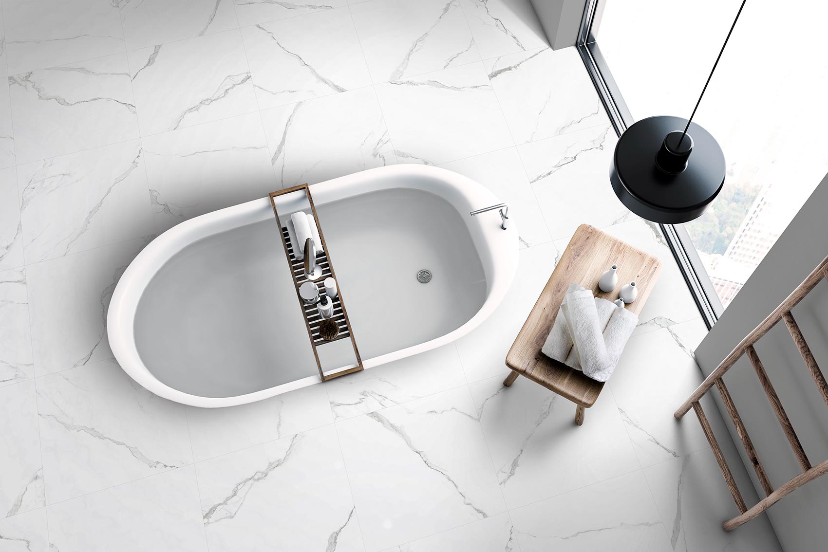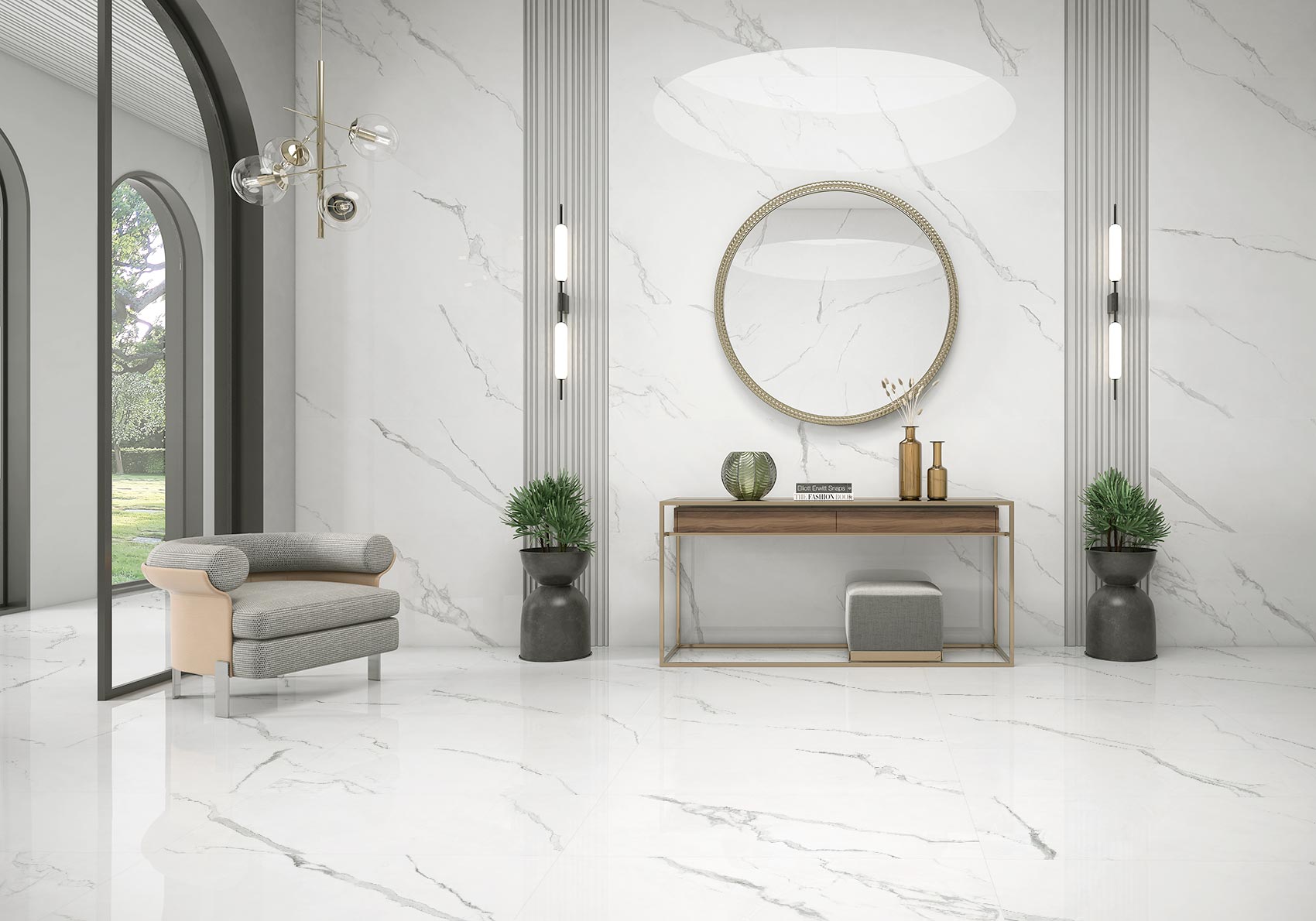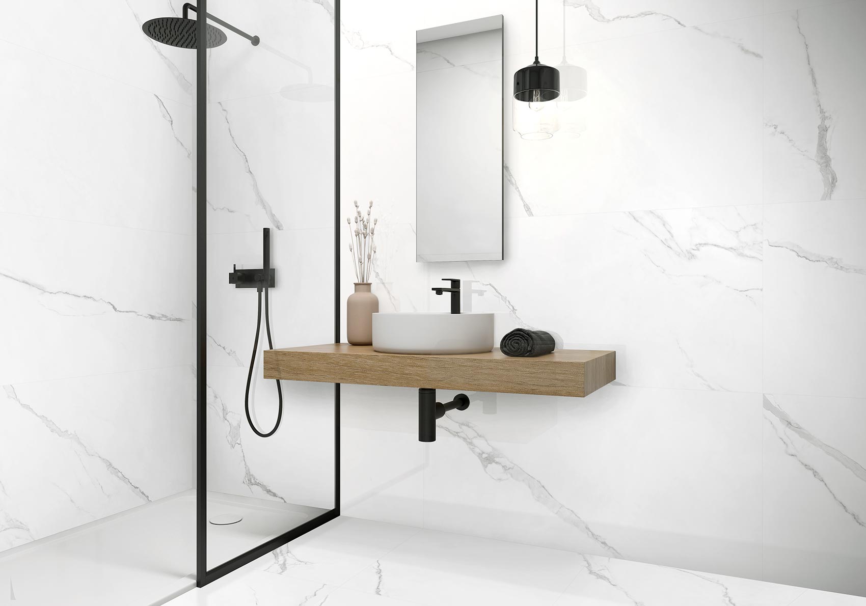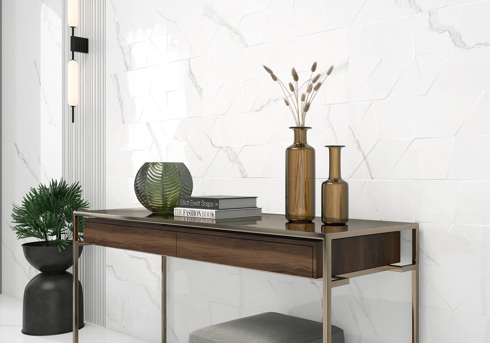 This highly resistant porcelain tile is available in various formats: 120x120, 60x120, 59.5x119.2, 90x90 and 59.5x59.5. It also comes in four finishes: Polished, Shiny, Matt and Matt+. The set is completed by the white paste base and relief tiles in size 31.6x100. The design of these geometric pieces featuring a seemingly mismatched appearance creates a sophisticated volume effect on walls.