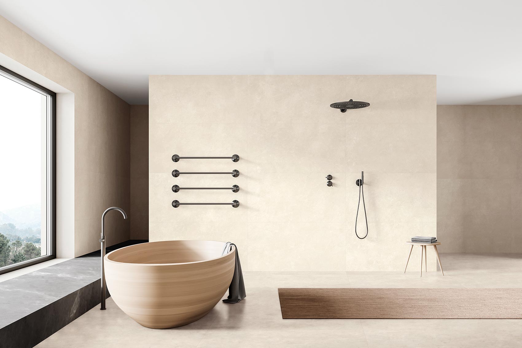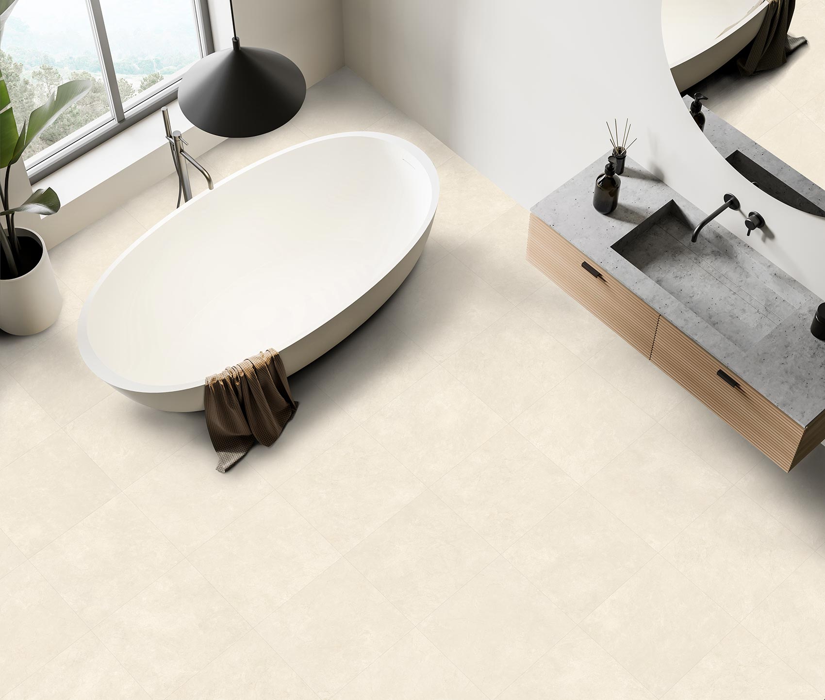 This design is available in porcelain in 120x120, 60x120, 59.5x119.2, 90x90 and 59.5x59.5 formats. Finishes: Polished, Shiny, Matt and Matt+. Decorate your warm bathroom, unmissable kitchen or your light and contemporary living room with this reworked beige marble tile.